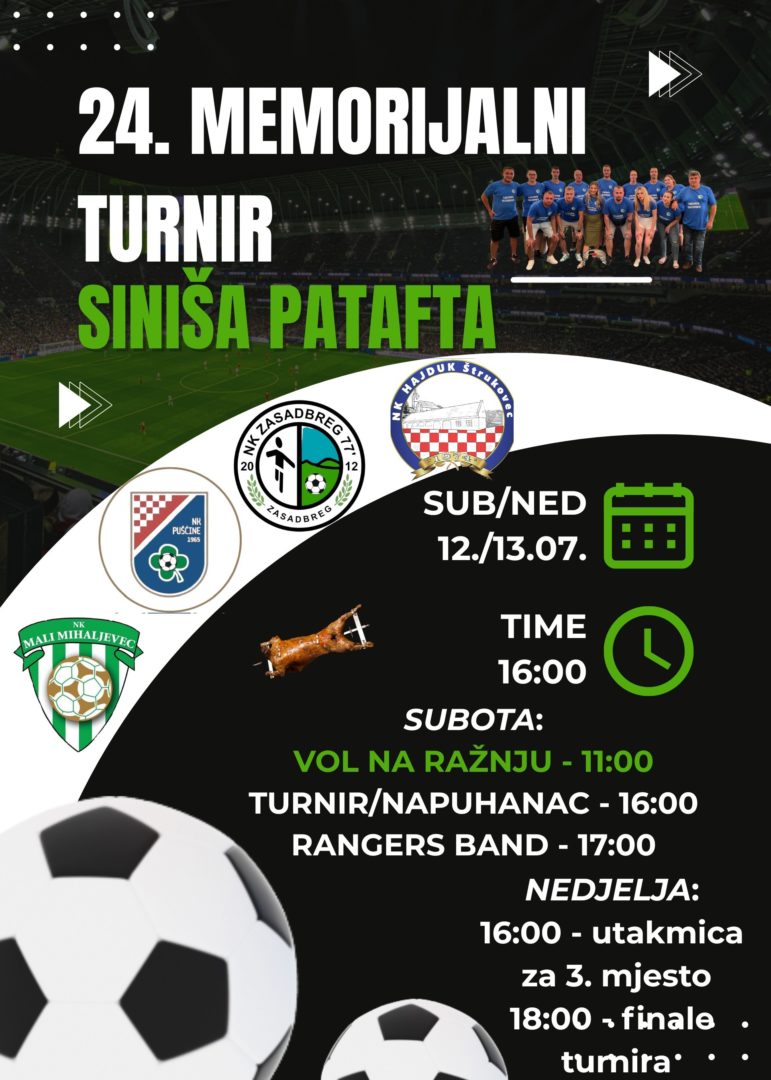 Nogometni klub Zasadbreg 77 s ponosom najavljuje održavanje 24. Memorijalnog turnira “Siniša Patafta”, koji će se održati predstojećeg vikenda, 12. i 13. srpnja. Ovaj tradicionalni turnir posvećen je uspomeni na Sinišu Pataftu, a svake godine okupi brojne ljubitelje nogometa i sportske entuzijaste.