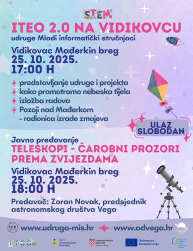 Udruga Mladi informatički stručnjaci (MIS) poziva sve zaljubljenike u astronomiju, tehnologiju i kreativnost na događaj “ITEO 2.0 na Vidikovcu”, koji će se održati na Mađerkinom bregu u subotu, 25. listopada 2025.